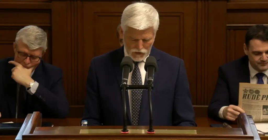 Ministr zahraničí a předseda Motoristů sobě Petr Macinka využil úterní vystoupení prezidenta Petra Pavla ve Sněmovně ke studiu Rudého práva. S deníkem, který byl před listopadem 1989 ústředním tiskovým orgánem Komunistické strany Československa (KSČ), se pochlubil i vedle sedícímu ministrovi obrany Jaromíru Zúnovi (za SPD).