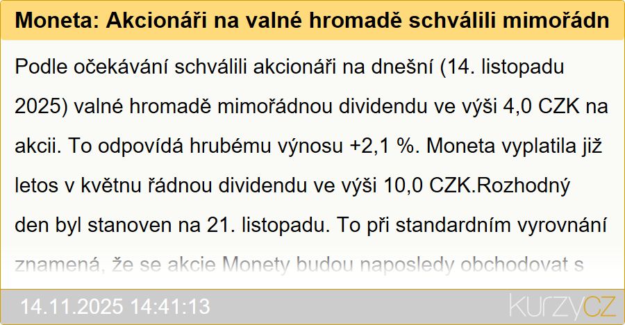 Rozhodný den byl stanoven na 21. listopadu. To při standardním vyrovnání znamená, že se akcie Monety budou naposledy obchodovat s nárokem na tuto mimořádnou dividendu ve středu 19. listopadu 2025.