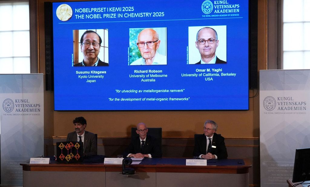 "Laureáti Nobelovy ceny za chemii pro rok 2025 vytvořili molekulární konstrukce s velkými dutinami, skrz které mohou proudit plyny a další chemikálie," uvedla akademie.
